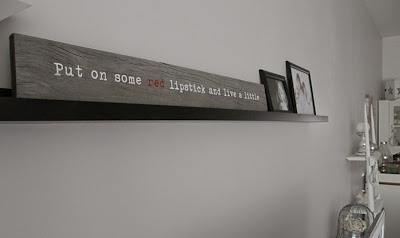 Niin kovasti tähän ihastuin! Simppeli toteutus,mutta ehkä just siks niin mainio. Ja muistuttaa kaiken hösiksenkin keskellä nauttia elämästä (ja yrittää olla ees vähän kaunis :D ) Kyllä mä jonkun aikaa jouduin pohtimaan minne tän lankun pätkän kotona lykkäisin, mutta tuossa tauluhyllyllä se on aika kiva. Osuu silmäänkin mukavan usein, kun on telkkarin yläpuolella.